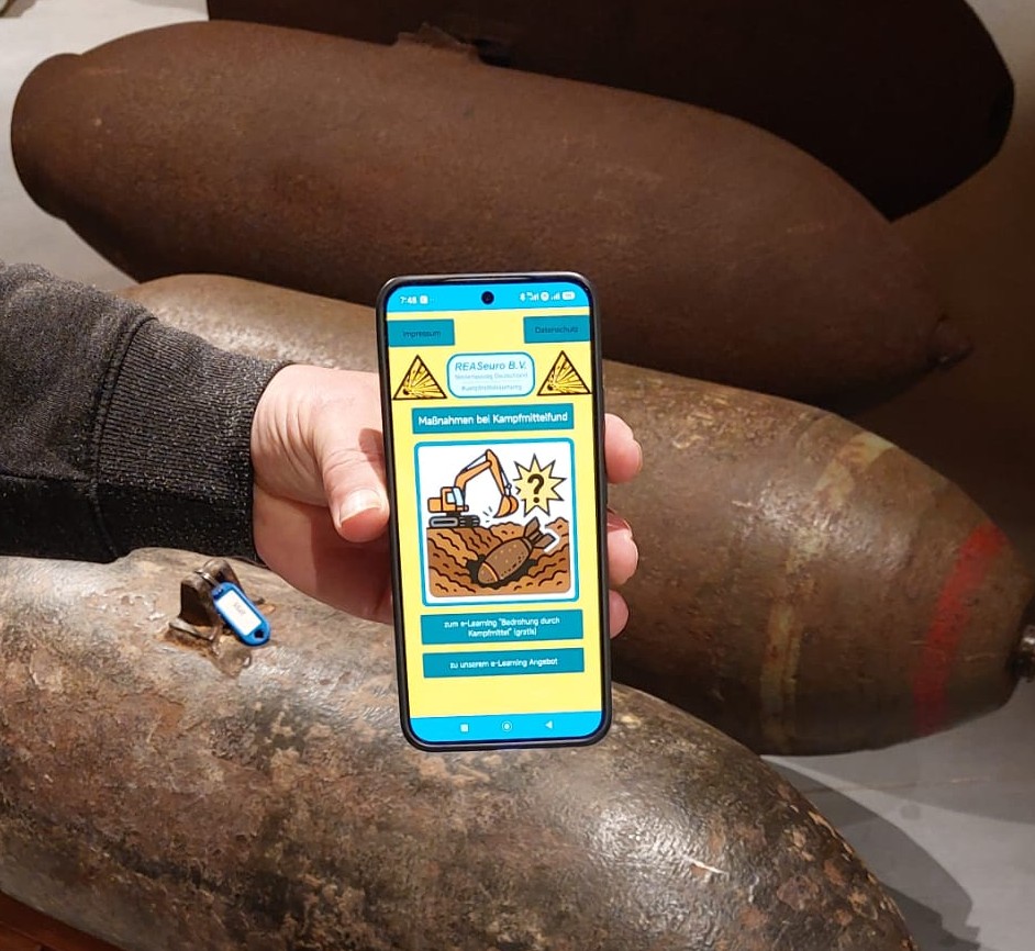 Unsere App zeigt die basalen Erstmaßnahmen bei einem überraschenden Kampfmittelfund bei Erbau- und Abbrucharbeiten.